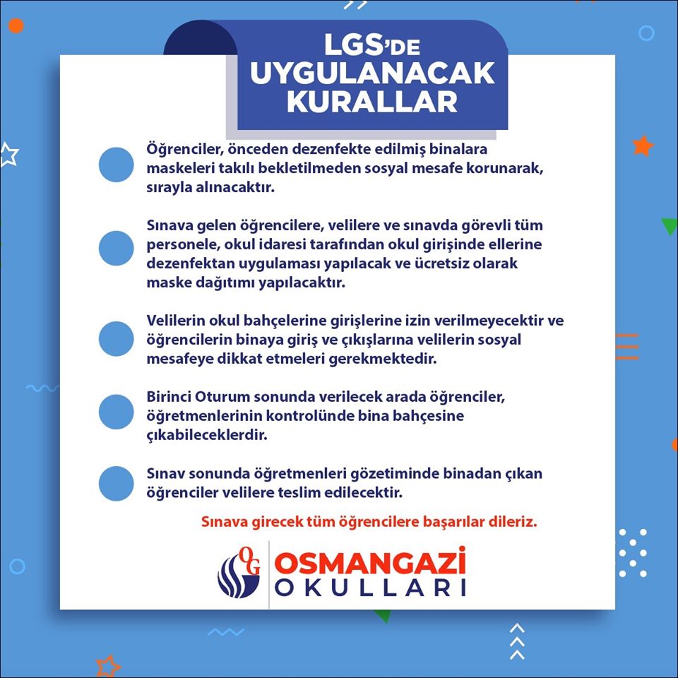 Sınava gelen öğrencilere, velilere ve sınavda görevli tüm personele, okul idaresi tarafından okul girişinde ellerine dezenfektan uygulaması yapılacak ve ücretsiz olarak maske dağıtımı yapılacaktır.