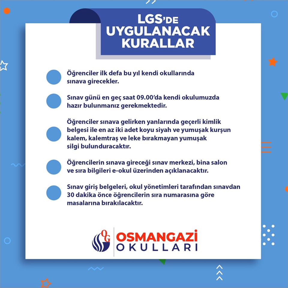 Öğrenciler ilk defa bu yıl kendi okullarında sınava girecekler. Sınav günü en geç saat 09.00’da kendi okulumuzda hazır bulunmanız gerekmektedir.